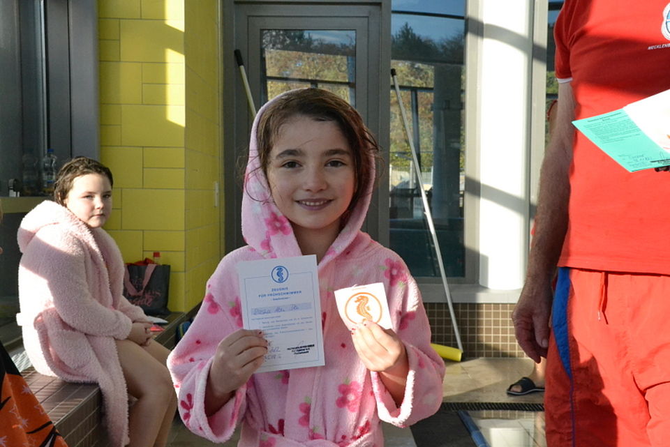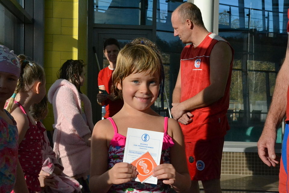 Bild 6: Endlich Frühschwimmer: Kira hat es geschafft und darf ihr Seepferdchen mit nach Hause nehmen. Foto: Caroline Awe