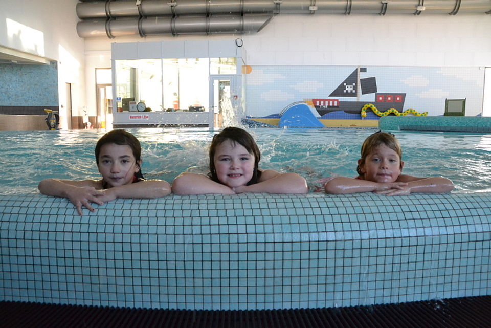 Bild 1: Rasha, Lilly und Kira (v.l.) sind aufgeregt – die Vorschülerinnen bekommen am Ende ihres Kita-Schwimmkurses ihr Seepferdchen. Foto: Caroline Awe