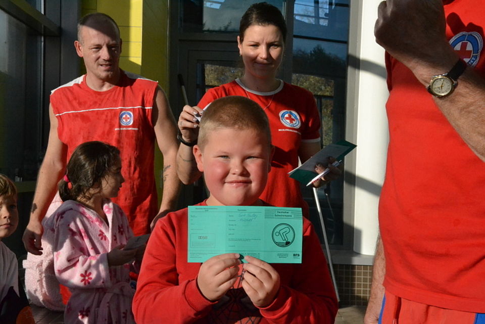 Bild 2: Geschafft: Christian Möller und Anne Münch überreichen Rasha ihr Seepferdchen. Foto: Caroline Awe